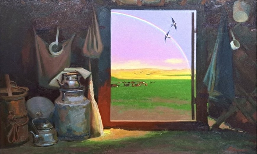 Монгол гэрийн доторх ахуй амьдрал болон гадаад ертөнцийн байгалийн үзэсгэлэнг гайхалтайгаар хослуулан харуулсан уран зураг.